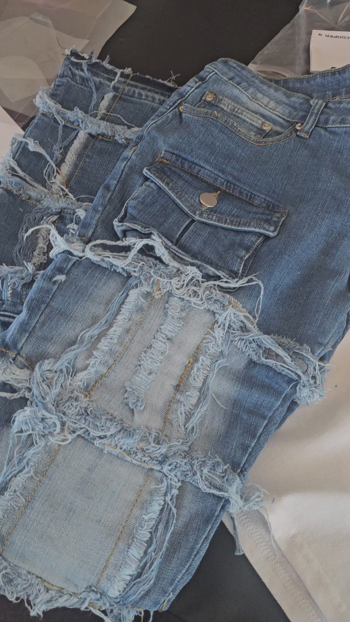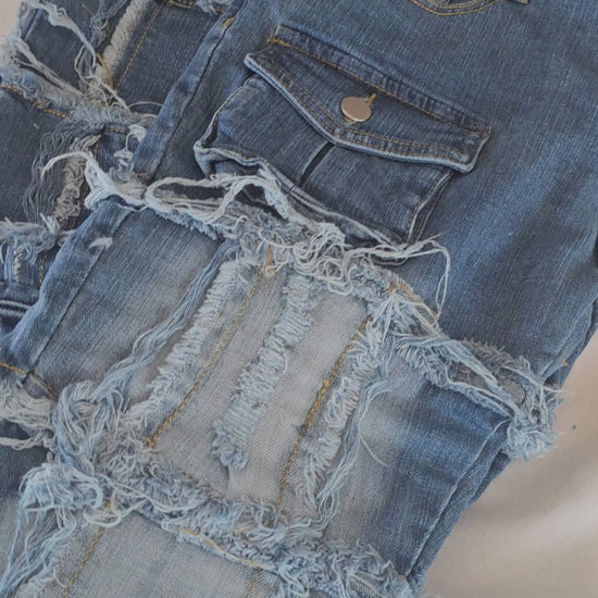 Turn heads the second you step in the room. Our Ripped Flare Styled Jeans take classic light-wash denim and flip it into a full statement piece. Heavy shredding runs from thigh to hem in a grid pattern, giving the jeans a raw, textured look that still feels polished and intentional. Four oversized cargo pockets sit high and low on the legs, adding utility and attitude while keeping your essentials close. The boot-cut flare stacks perfectly over your favorite sneakers or boots for that modern, street-ready silhouette.